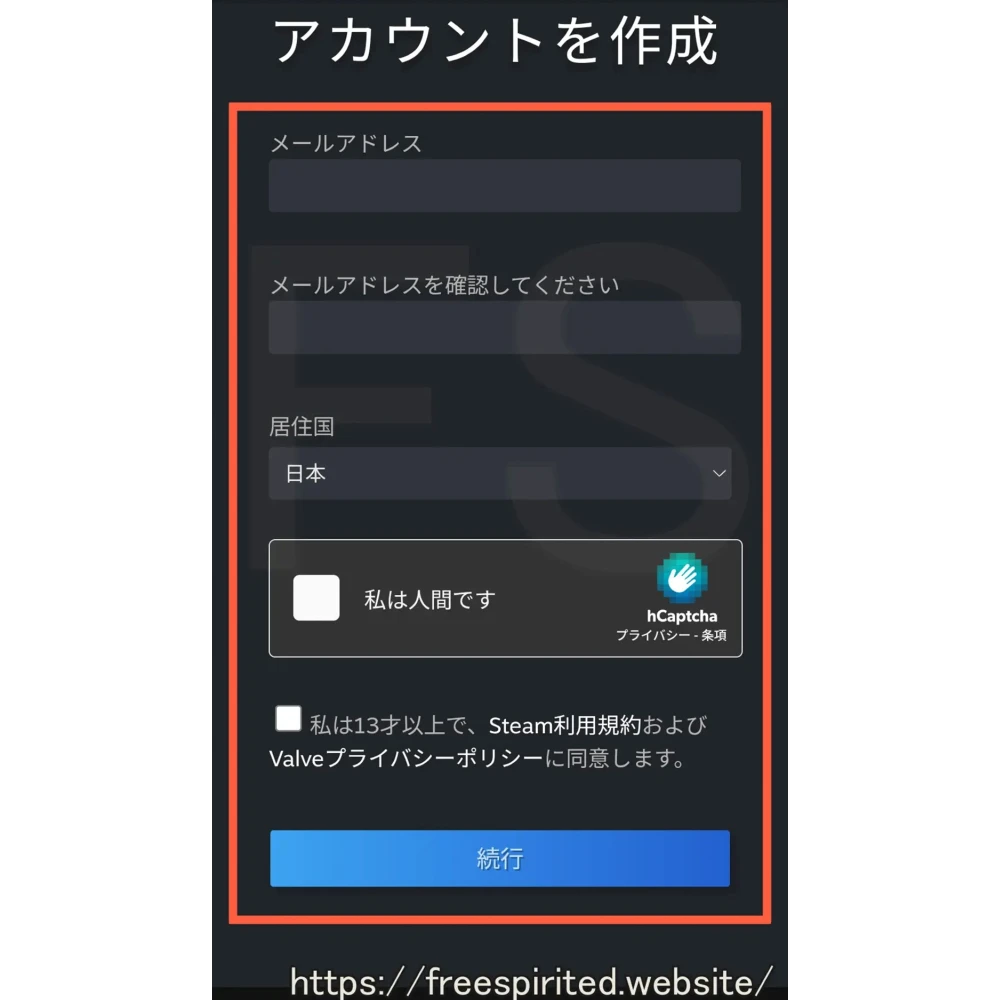 「Steam利用規約」および「Valveプライバシーポリシー」を確認・同意したらチェックを入れ、13才以上なら「続行」をタップします。
