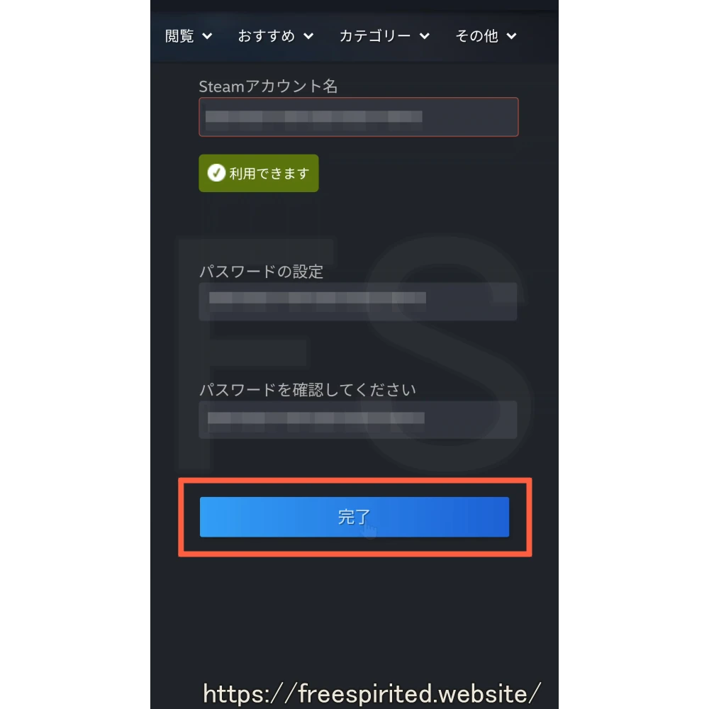 「Steamアカウント名」と設定する「パスワード」を入力し、「完了」をタップ。