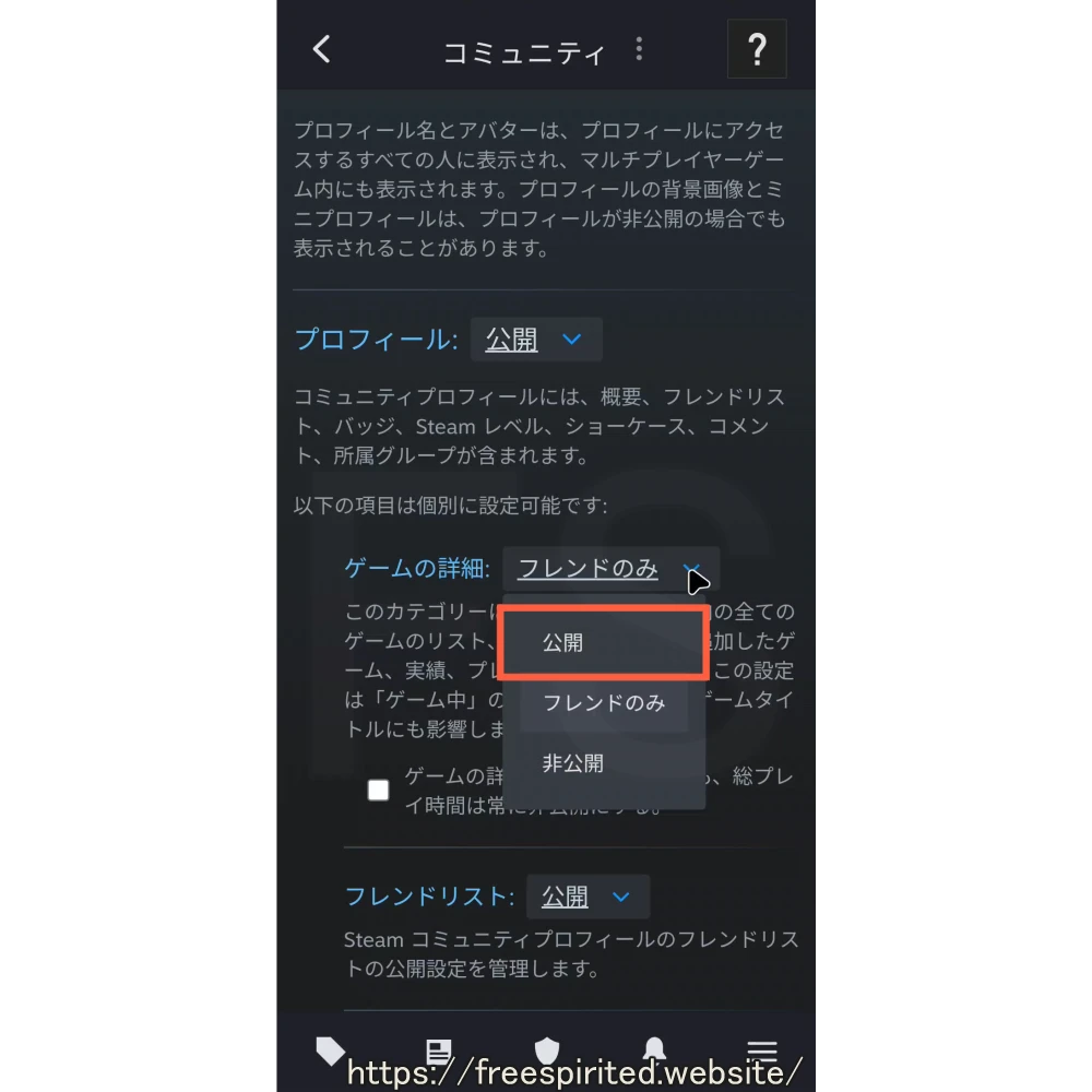 『プロフィール』にある『ゲーム詳細』の「フレンドのみ」をタップし、「公開」をタップします。